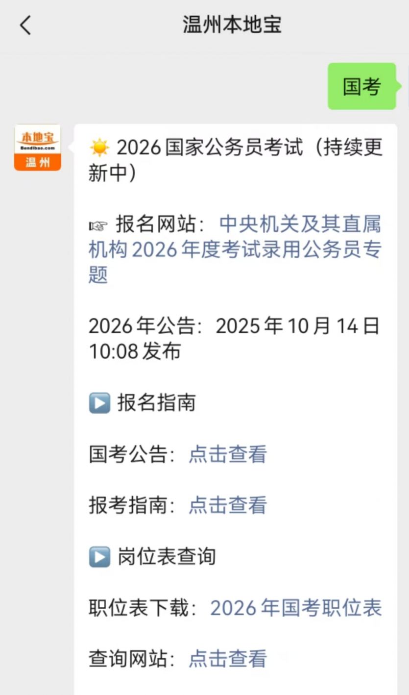 温馨提示:微信搜索公众号【温州本地宝】,关注后对话框回复【国考】可获2026年度国考报名时间、入口等报名指南,以及岗位表查询入口、常见问答等最新消息。
