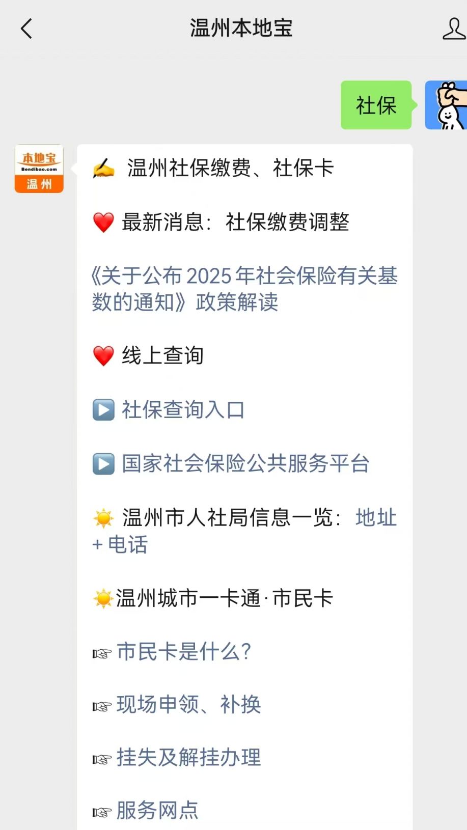 大家可以长按并识别上方二维码,关注并进入【温州本地宝】微信公众号,对话框回复【社保】获取浙江/温州最新社保缴费基数,社保办事指南、机构地址等相关内容。